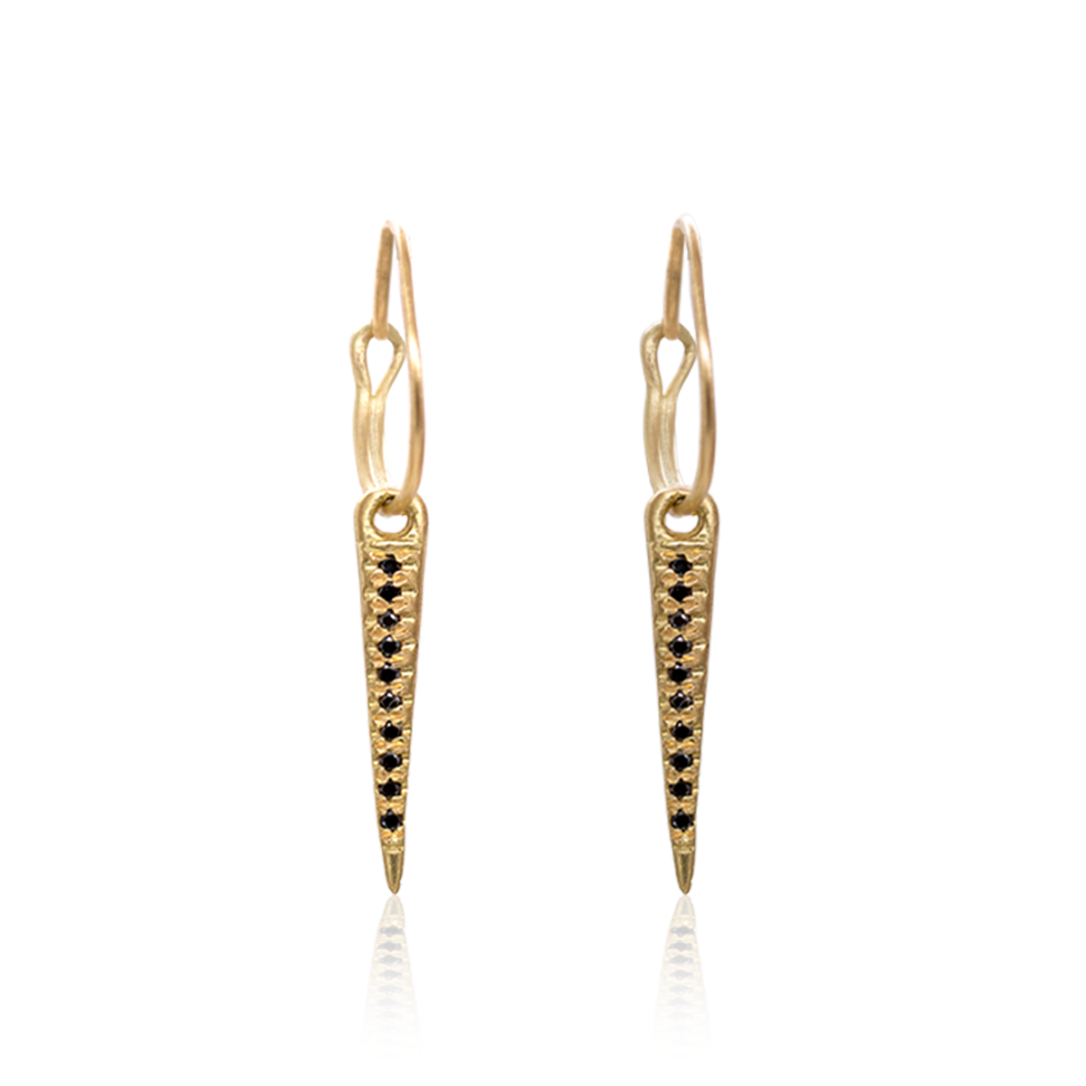 עגיל חישוק מזהב עם תליון קונוס צר משובץ 10 יהלומים שחורים
