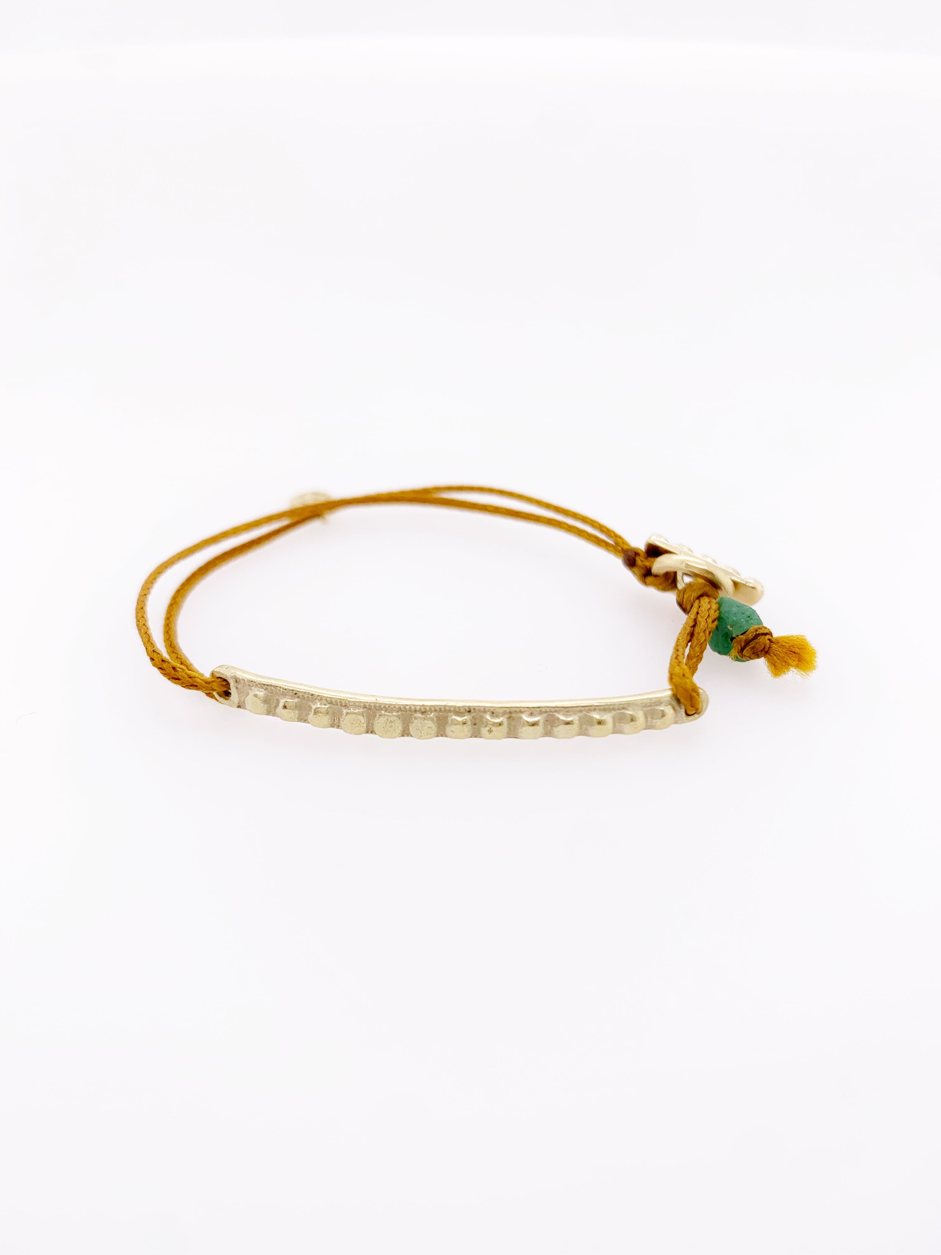 Cotton thread bracelet with small stripe element in Bedouin style in 14 or 18 karat yellow gold decorated with gold dots, with gold clasp, gold logo and antique bead