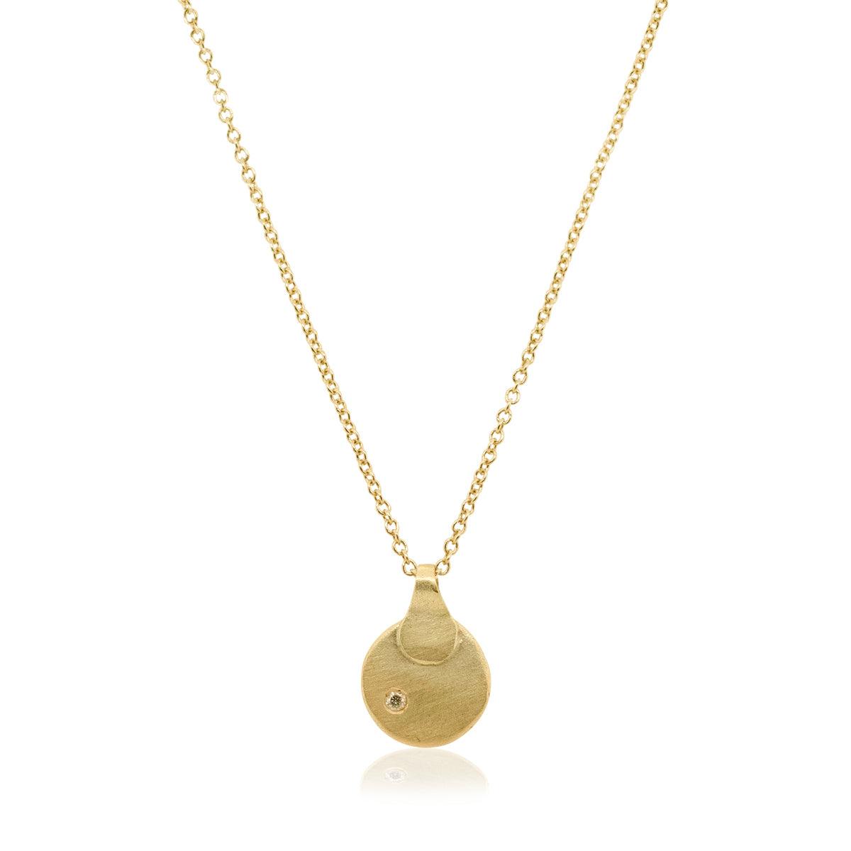 A Yellow Gold necklace with a pita shaped pendant set with a white diamond.