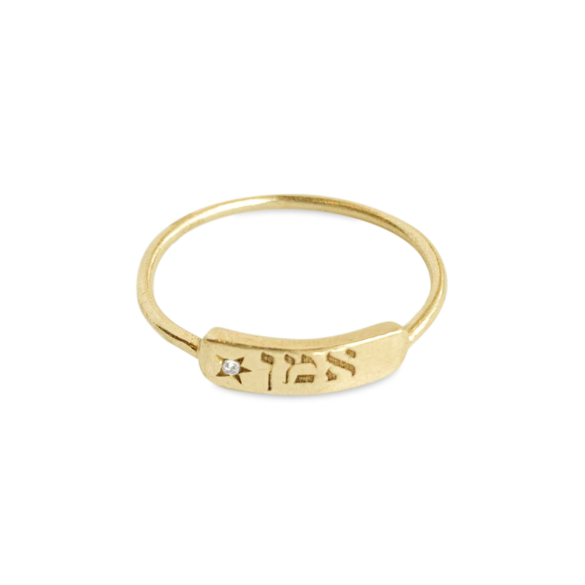 טבעת זהב עם לוחית מלבנית עליה חרוטה המילה ״אמן״ ושיבוץ של יהלום בצורת כוכב