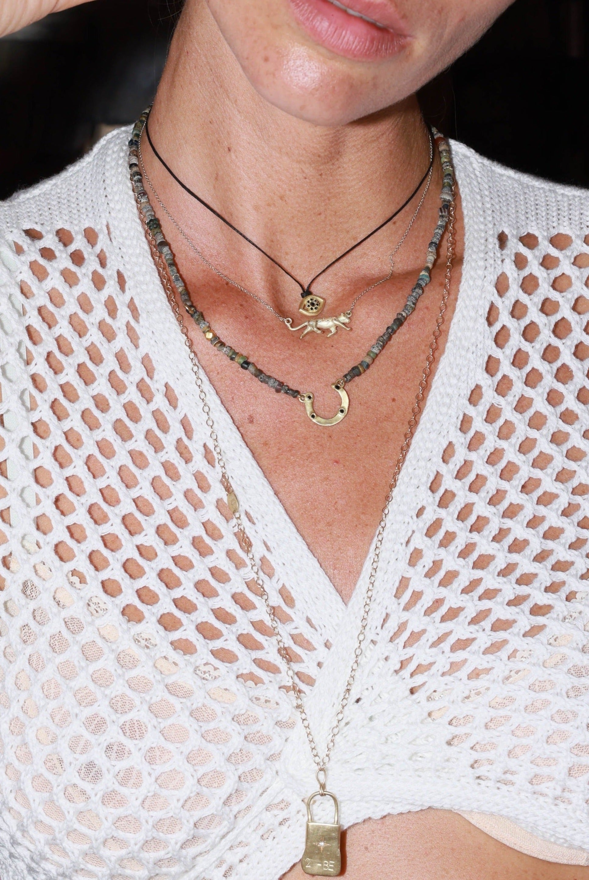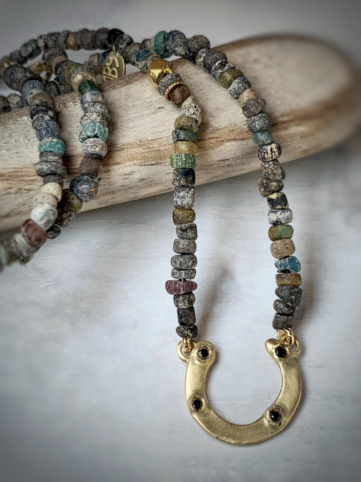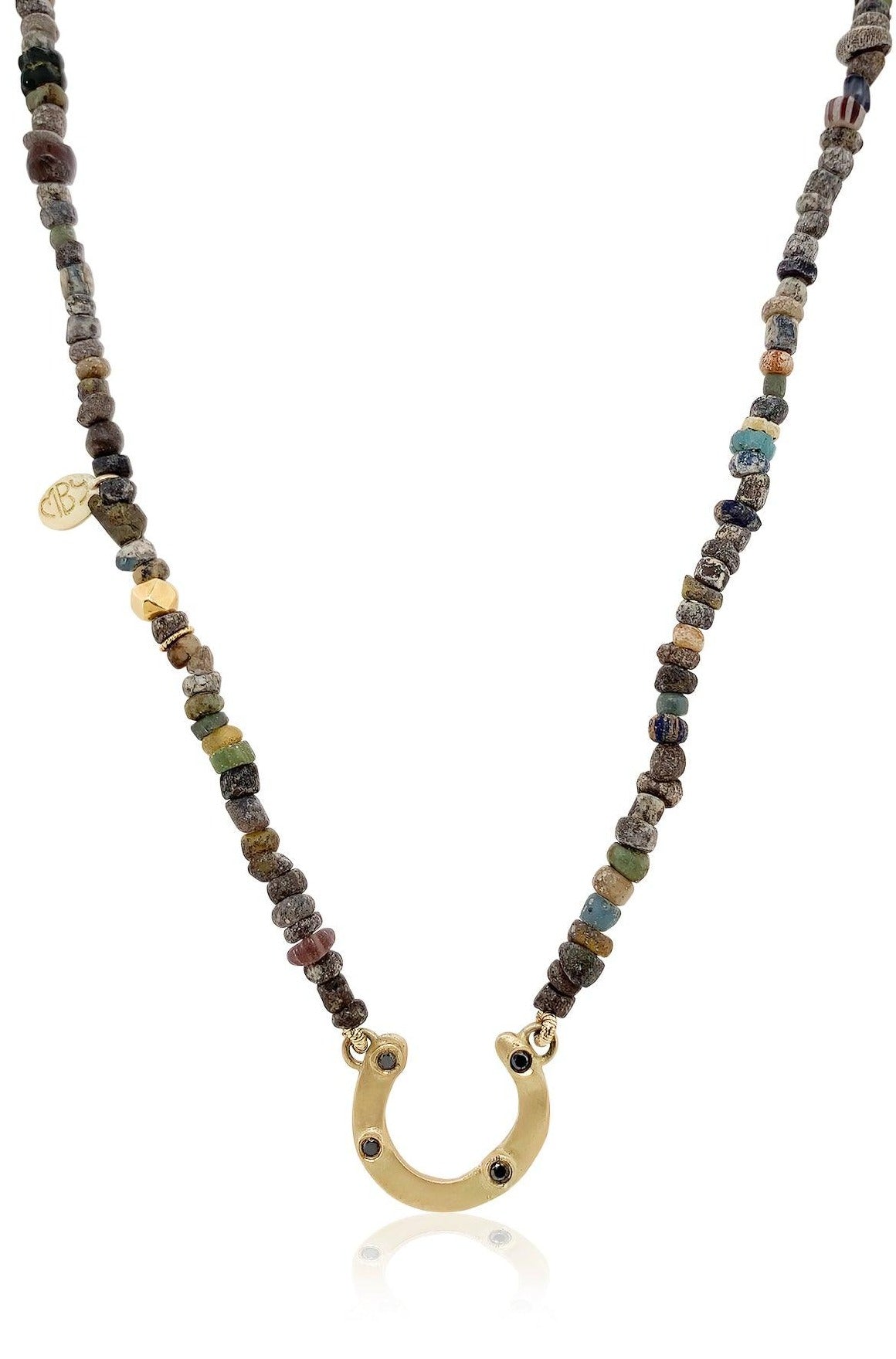 שרשרת מאבנים עתיקות עם תליון פרסה משובץ יהלומים שחורים