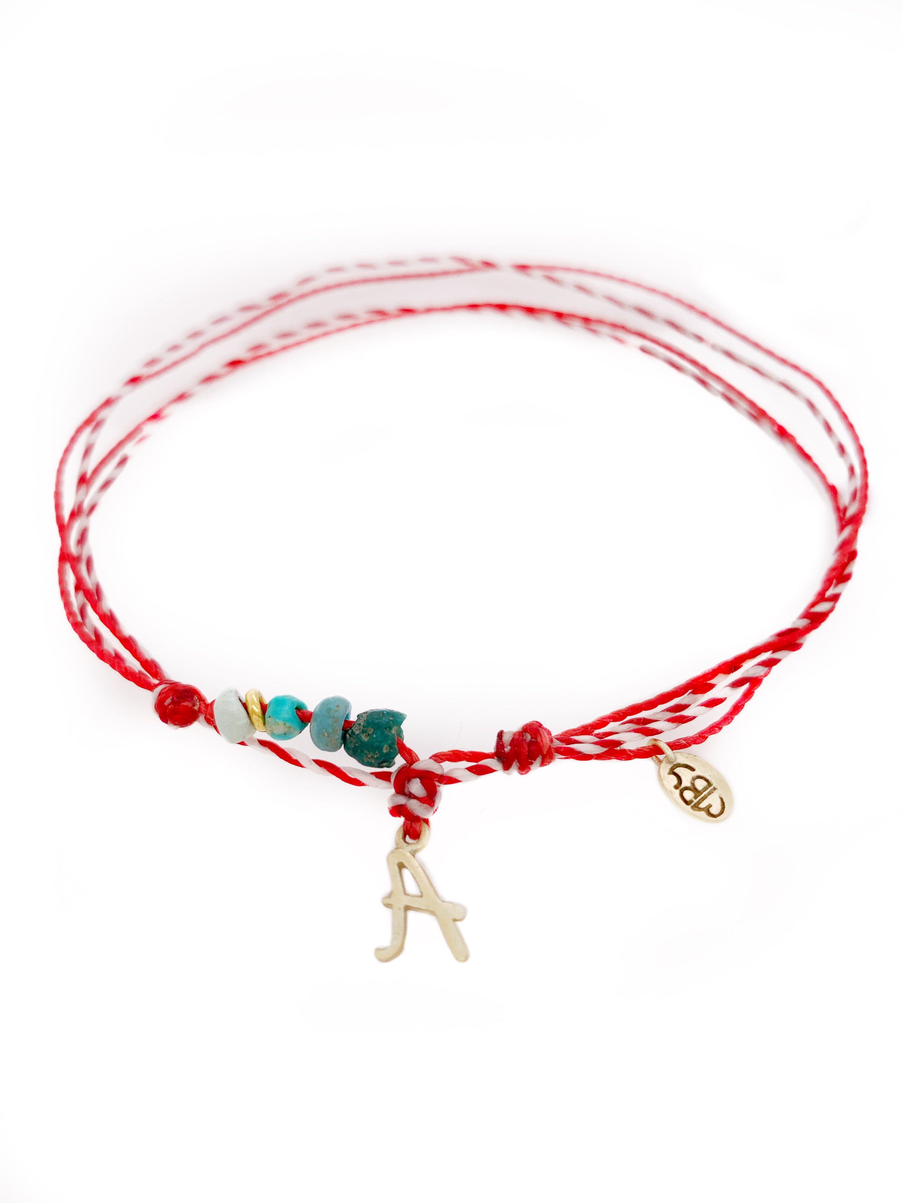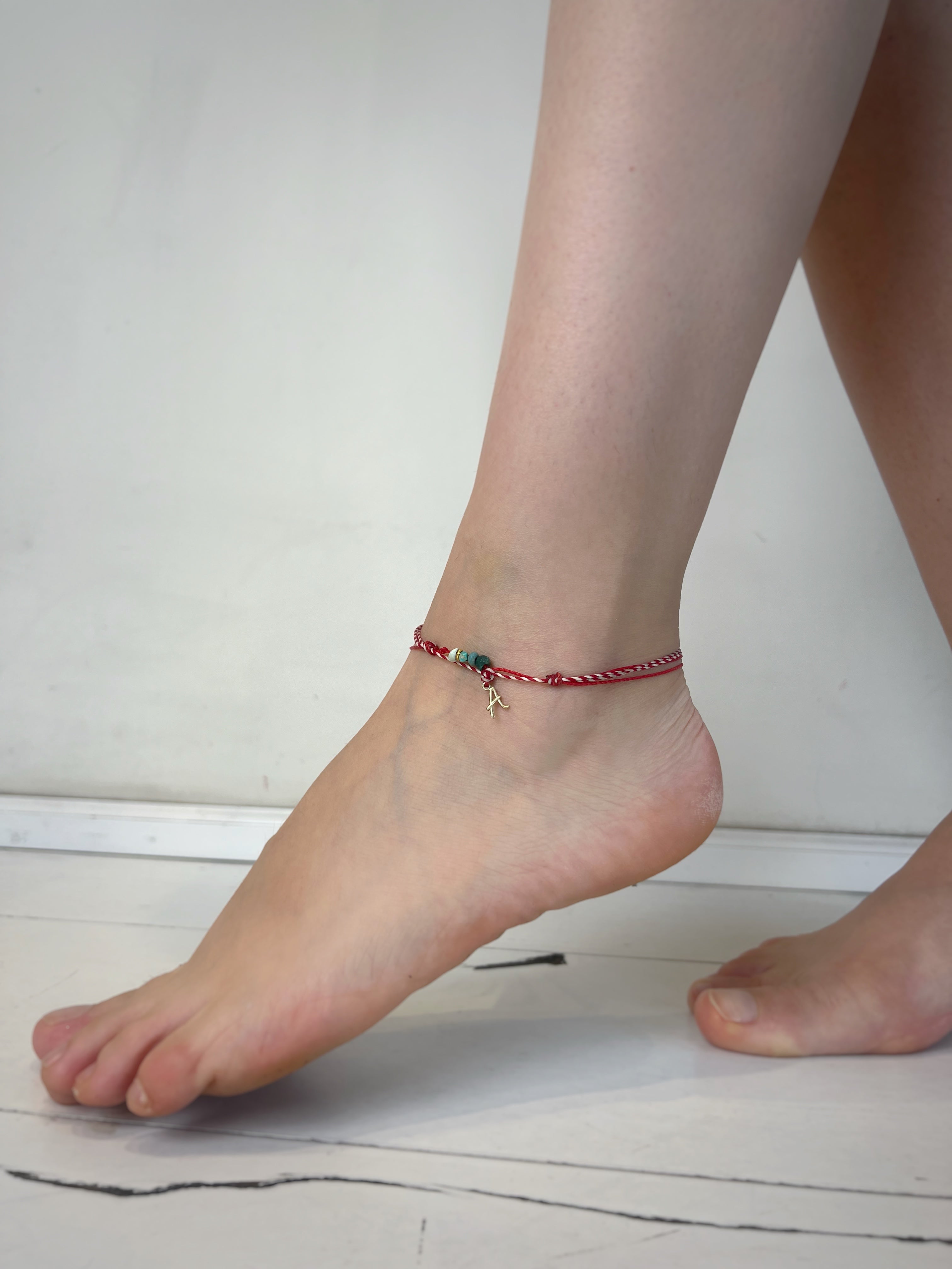 צמיד לרגל על חוט מתכוונן עם חרוזים עתיקים ואות לבחירה מזהב או מכסף. יש לציין את האות הרצויה בהערות בקופה
