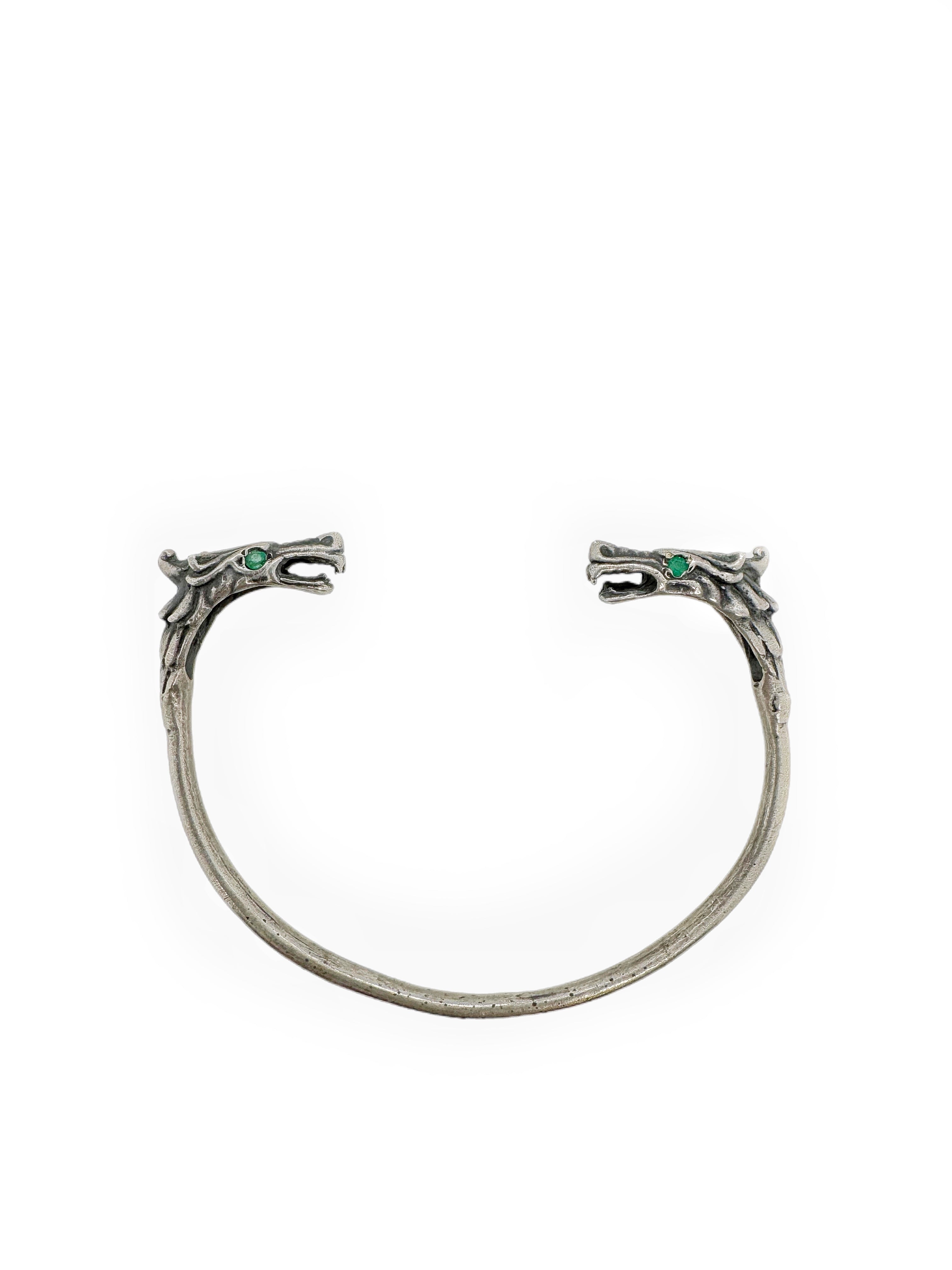 צמיד כסף פתוח אשר בקצוותיו ראשי דרקון מסתכלים האחד לעבר השני ומשובצים אמרלדים