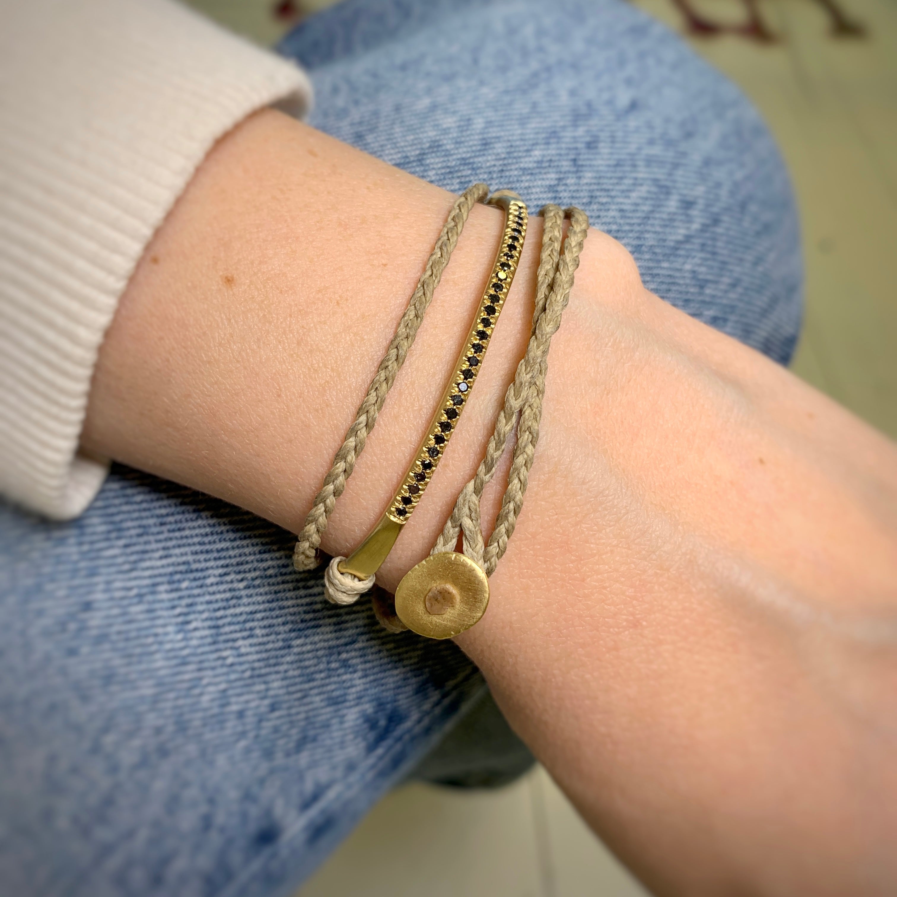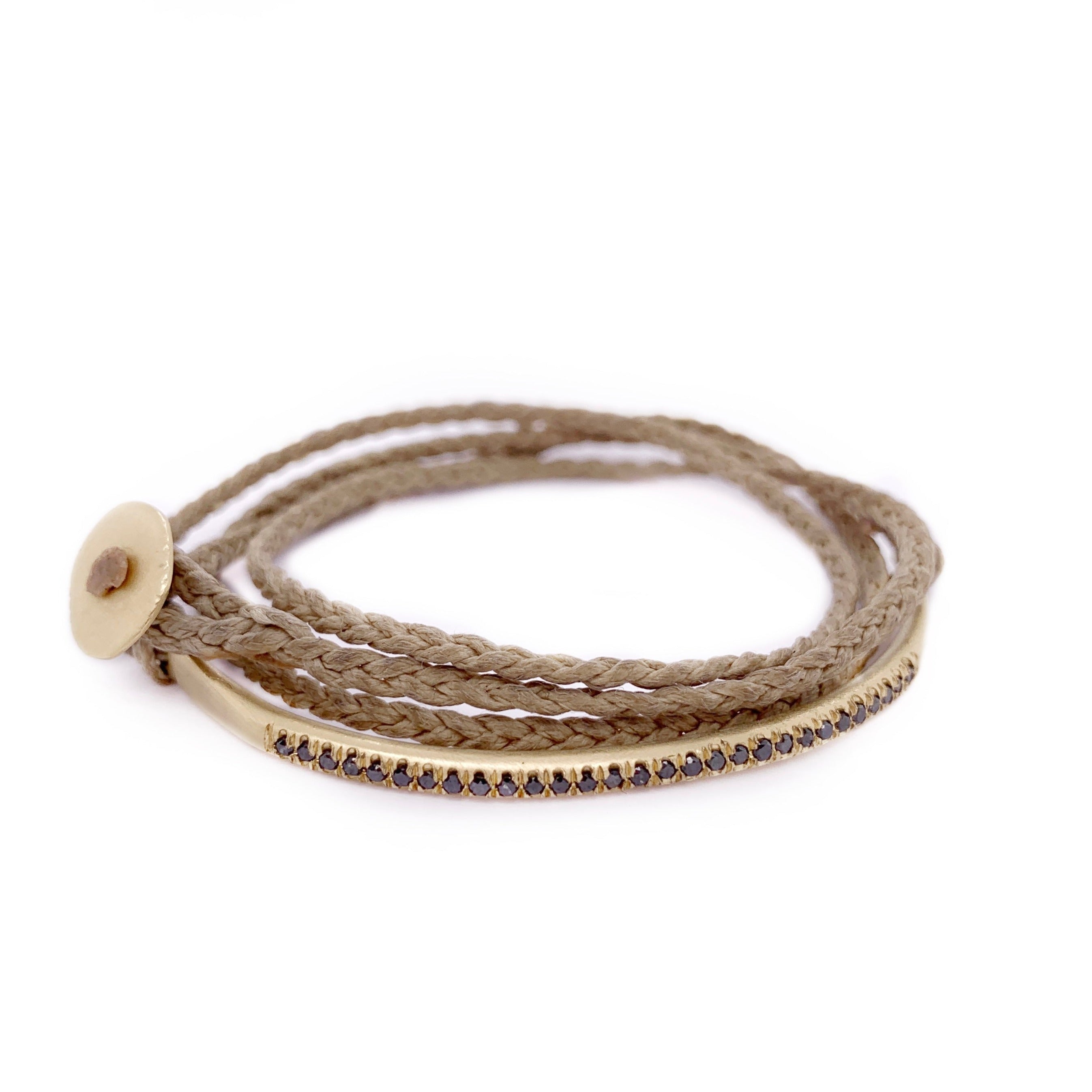 צמיד עשוי חצי חישוק זהב, משובץ ב 30 יהלומים שחורים ותוספת של צמיד ארוג בעבודת יד עם סוגר מזהב. צבע החוט ניתן לבחירה