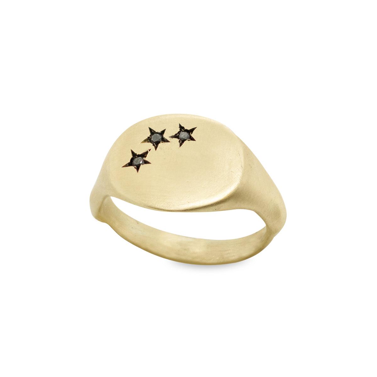 טבעת חותם זהב עם שלושה כוכבים חרוטים משובצים יהלומים שחורים