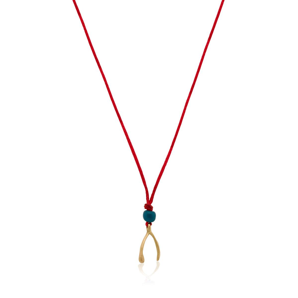 תליון עצם המשאלות מזהב על שרשרת שרוך אדום וחרוז טורקיז עתיק