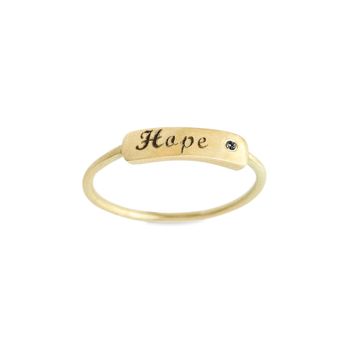 טבעת זהב עם לוחית מלבנית עליה חרוטה המילה ״תקווה״ באנגלית ושיבוץ של יהלום שחור בצורת כוכב