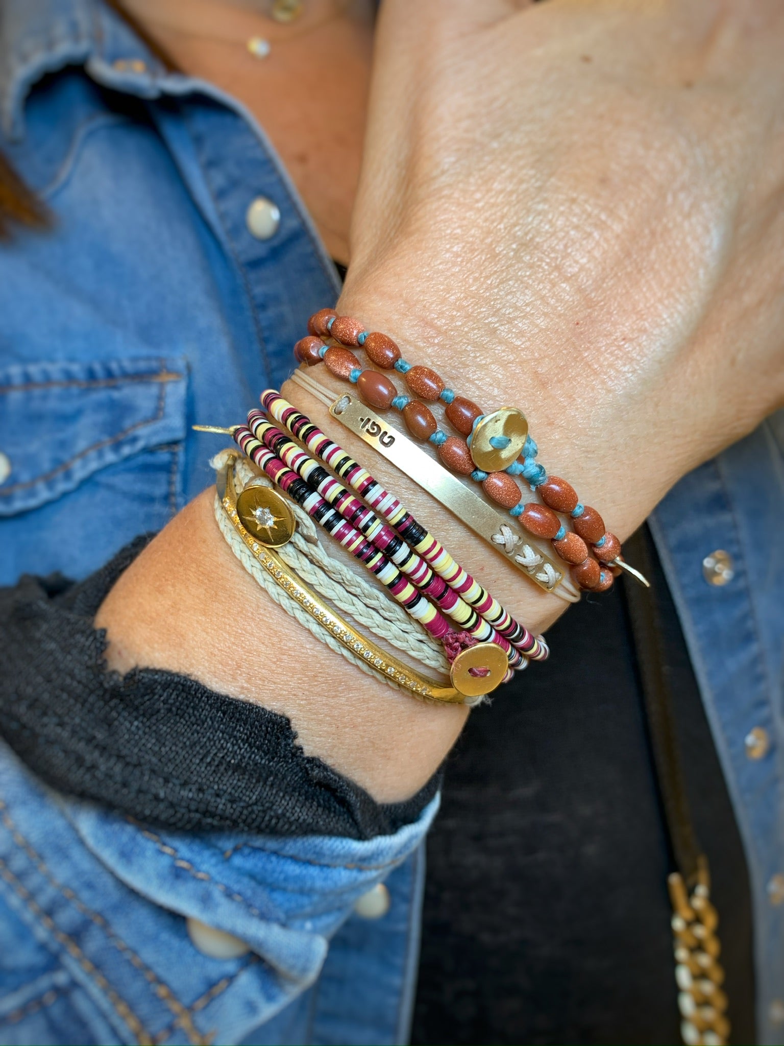 צמיד עשוי חצי חישוק זהב, משובץ ב 3 יהלומים ותוספת של צמיד ארוג בעבודת יד עם סוגר מזהב. צבע החוט ניתן לבחירה