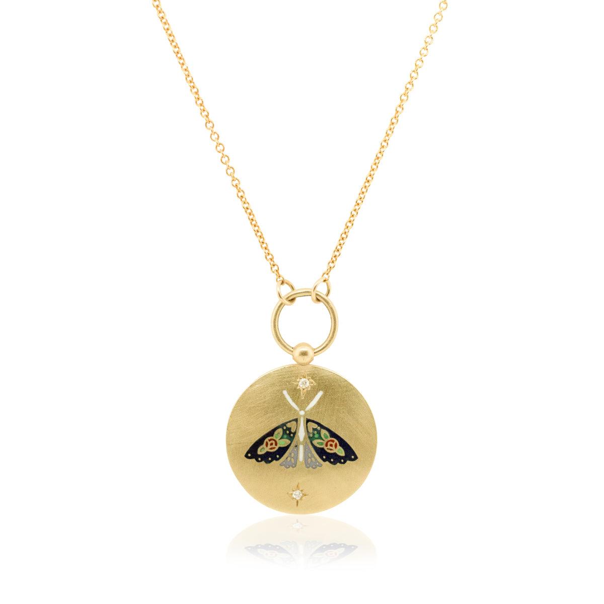 תליון אמייל עגול עם קעקוע פרפר ועם יהלום על שרשרת זהב צהוב