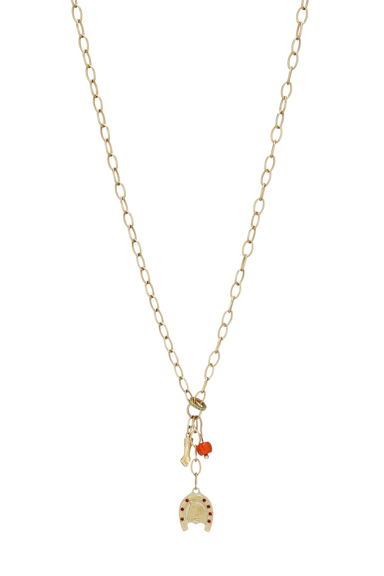 תליון פרסה עם ראש סוס משובץ 7 רובינים, יד אגרוף משובצת 5 יהלומים לבנים, טבעת משובצת 13 אמרלדים ותליון עם אבן עתיקה