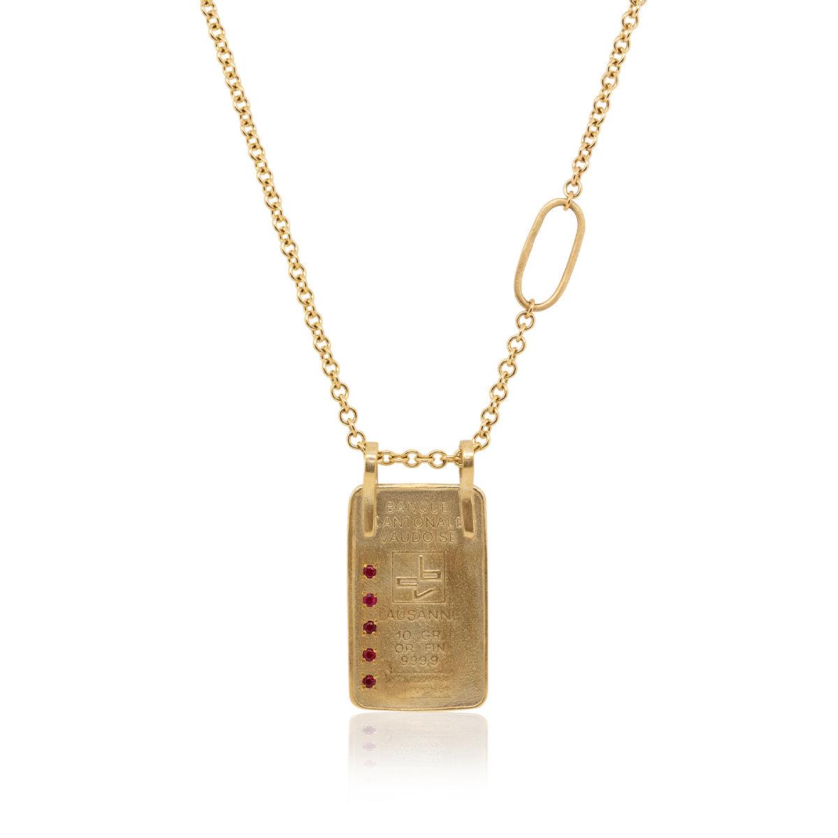 שרשרת זהב צהוב עם תליון אונקיה עם ברכת זהב חרוטה ומשובץ ב 5 אבני רובי