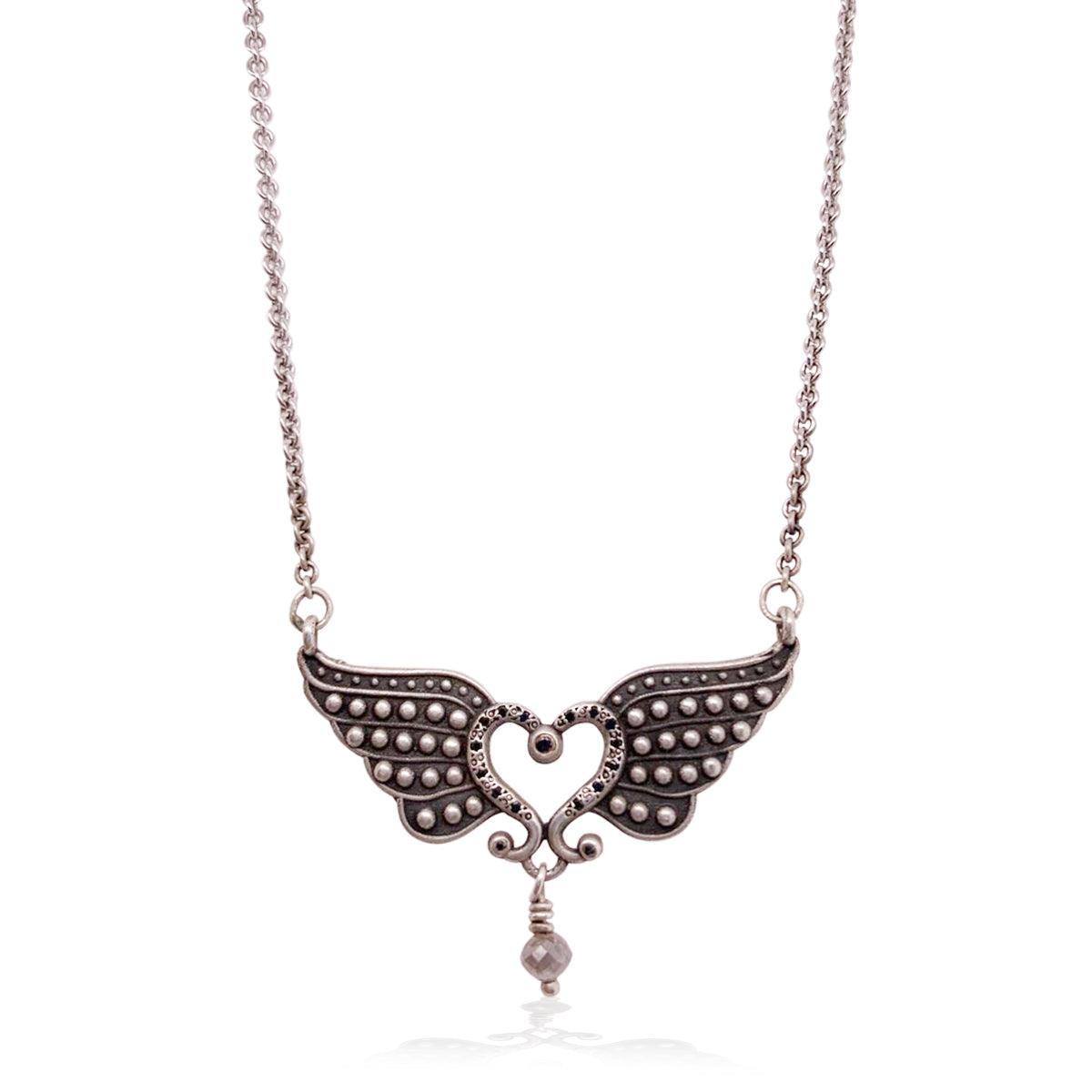 תליון כנפי פרפר מכסף עם לב במרכז ויהלומים שחורים משובצים