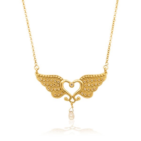 תליון כנפי פרפר עם לב במרכז ויהלומים משובצים בזהב