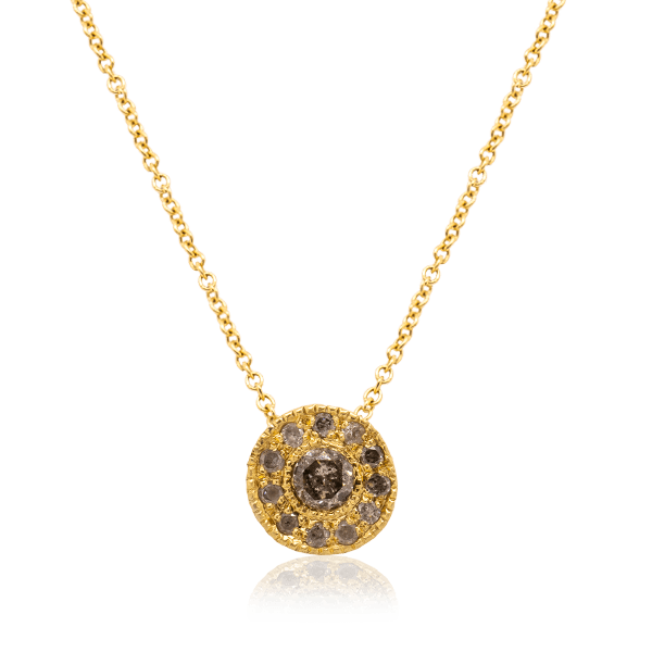 שרשרת זהב צהוב 18 קראט עם תליון עגול ובו יהלום אפור מרכזי אחד וסביבו יהלומים קטנים יותר משובצים בזהב