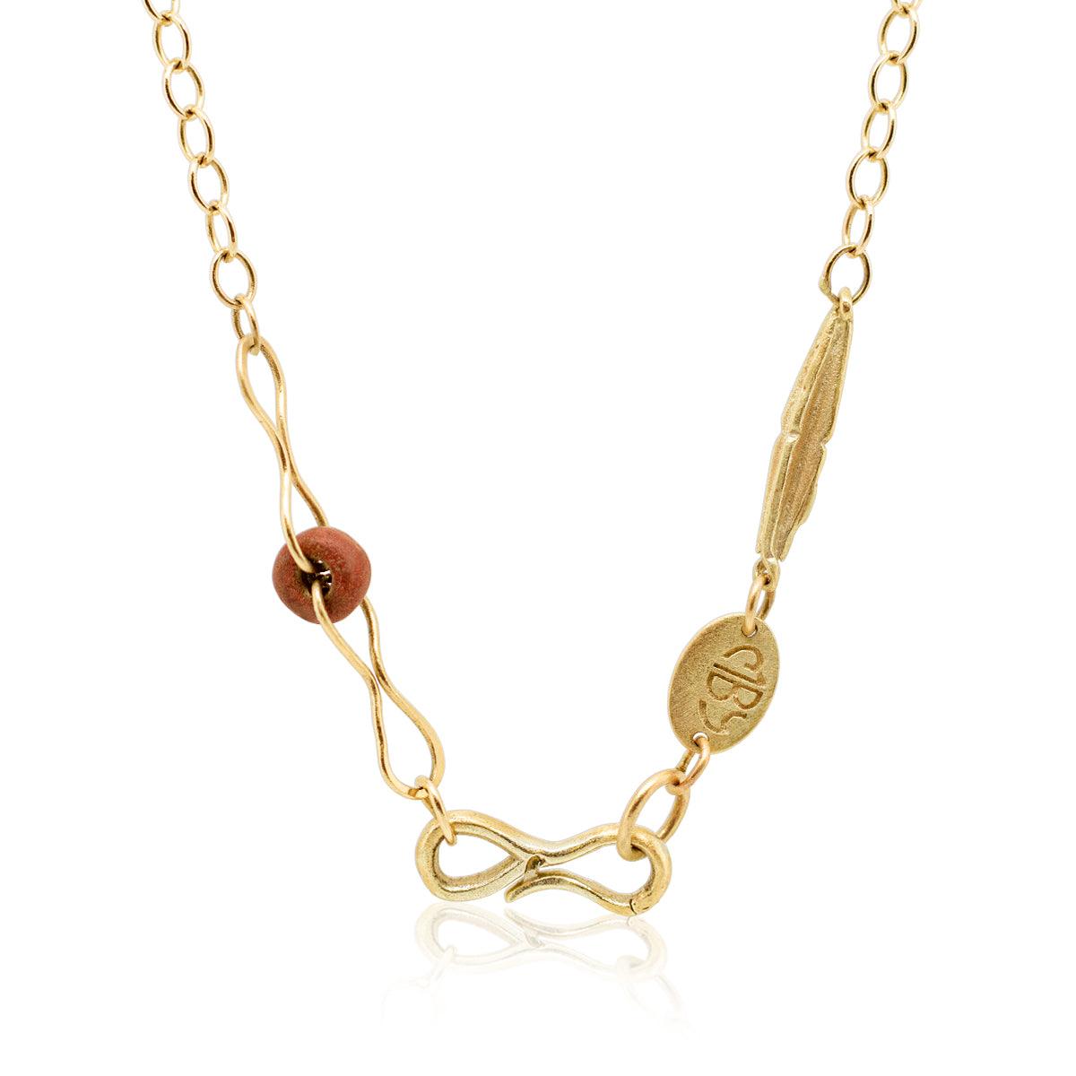 שרשרת זהב צהוב 14 קראט עם תליון אלמנט שעון עתיק, חרוז עתיק וסוגר קליק.