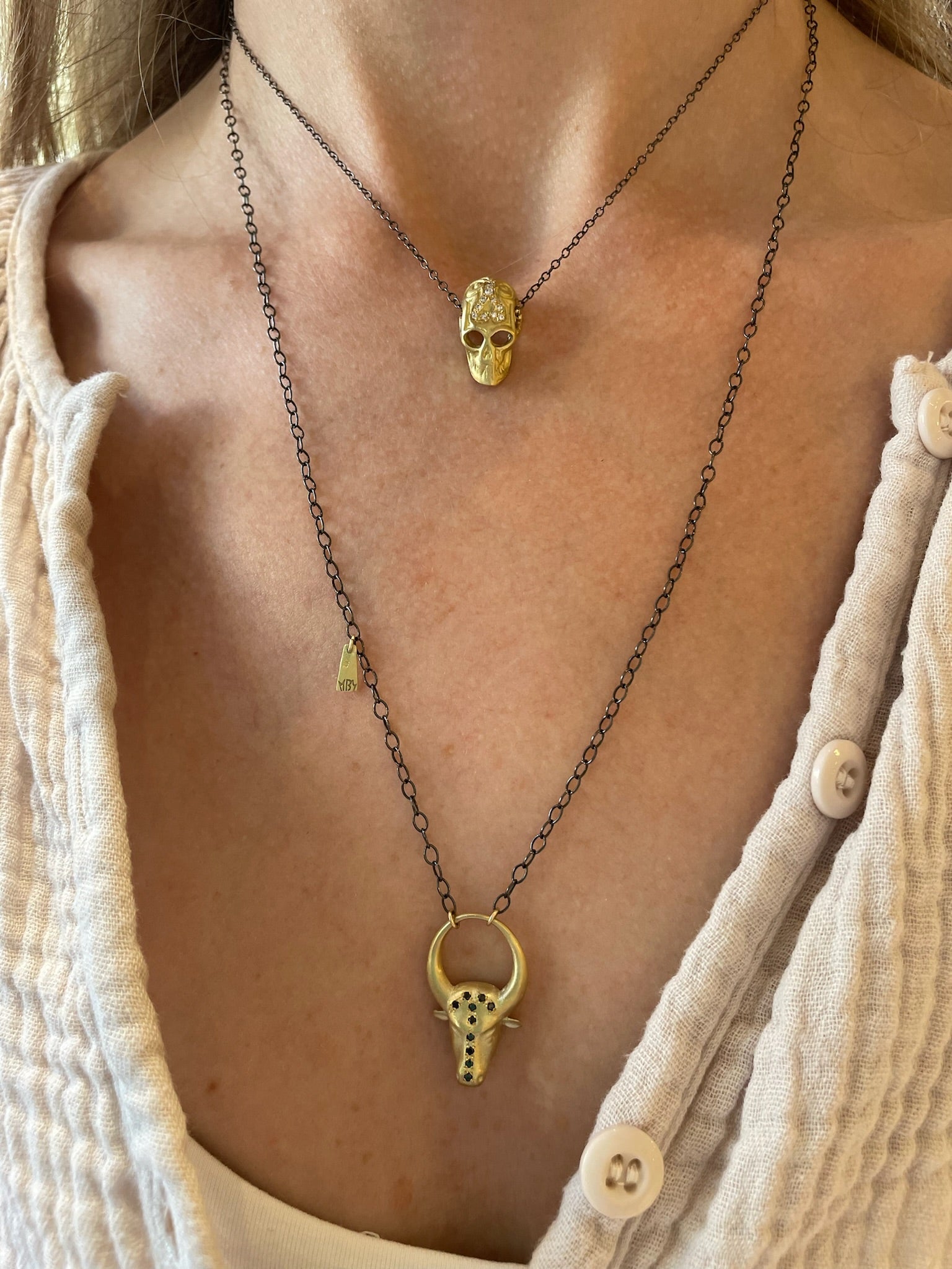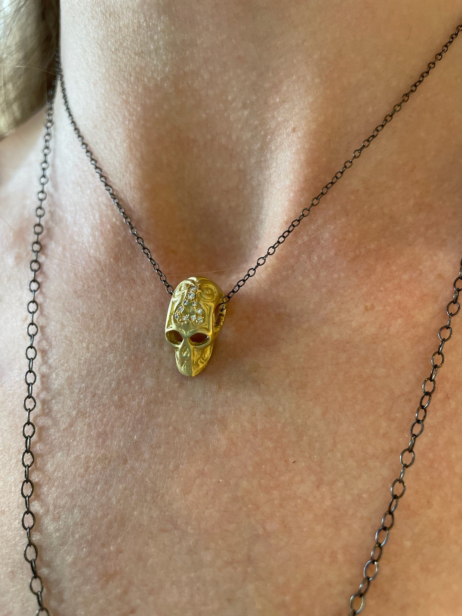 שרשרת כסף מושחר עם תליון גולגולת מזהב משובץ 10 יהלומים לבנים