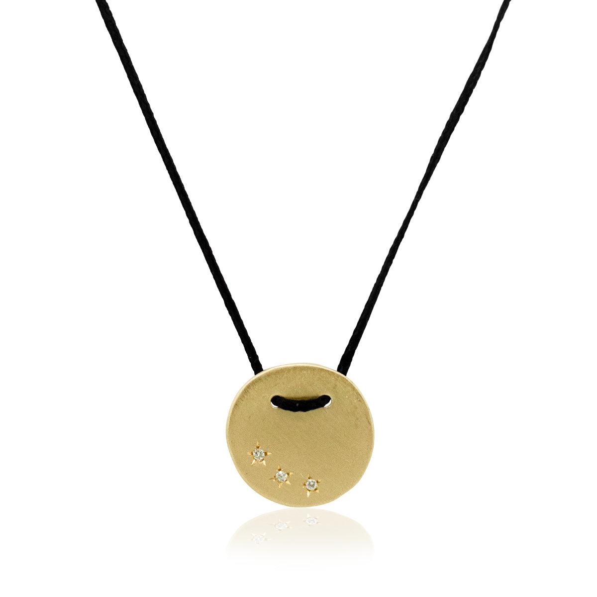 שרשרת שרוך שחור עם תליון עגול זהב צהוב 14 קראט משובץ בשלושה יהלומים בצורת כוכב