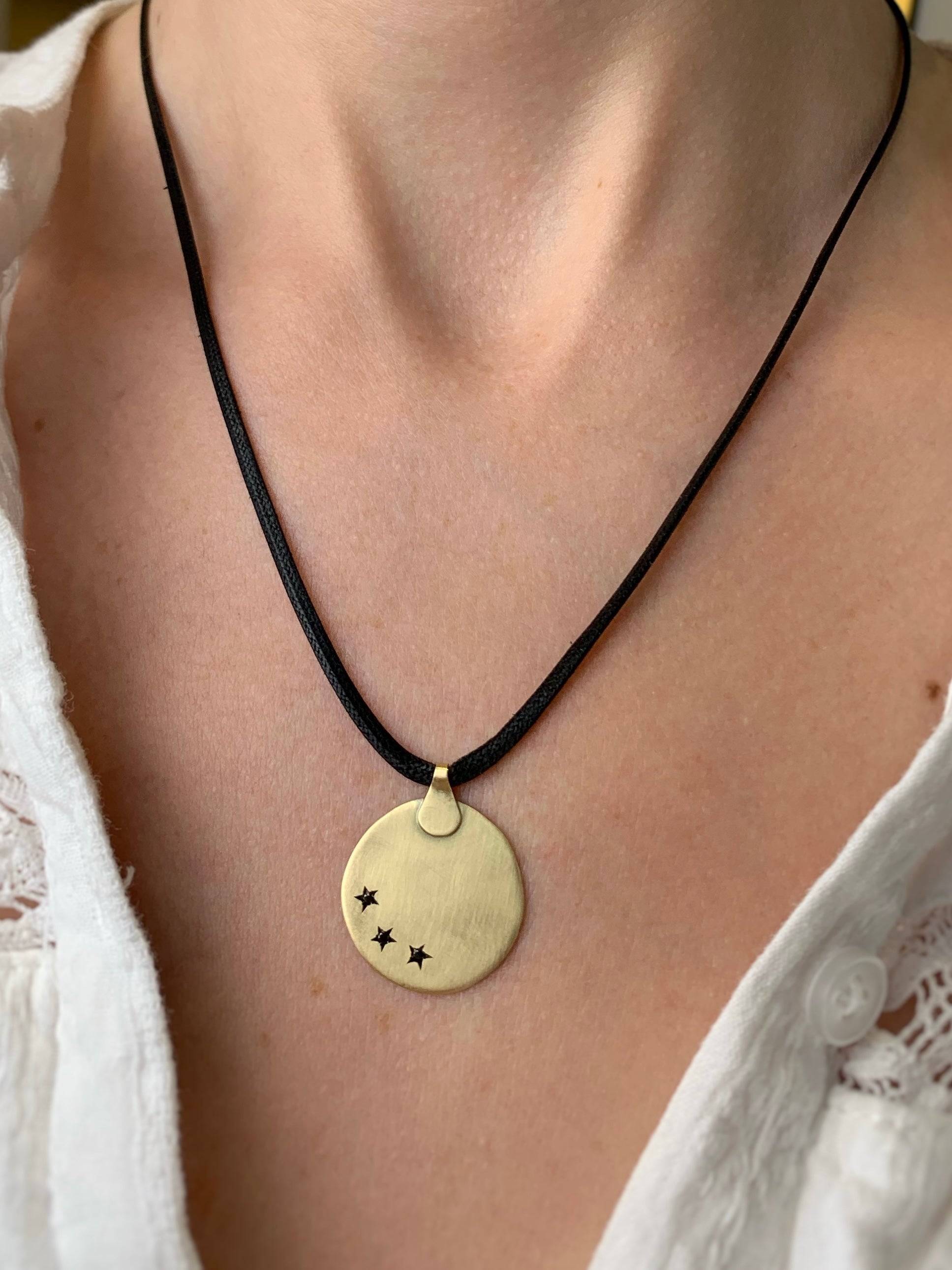 שרשרת שרוך שחור עם תליון בצורת פיתה משובץ שלושה יהלומים שחורים בצורת כוכב