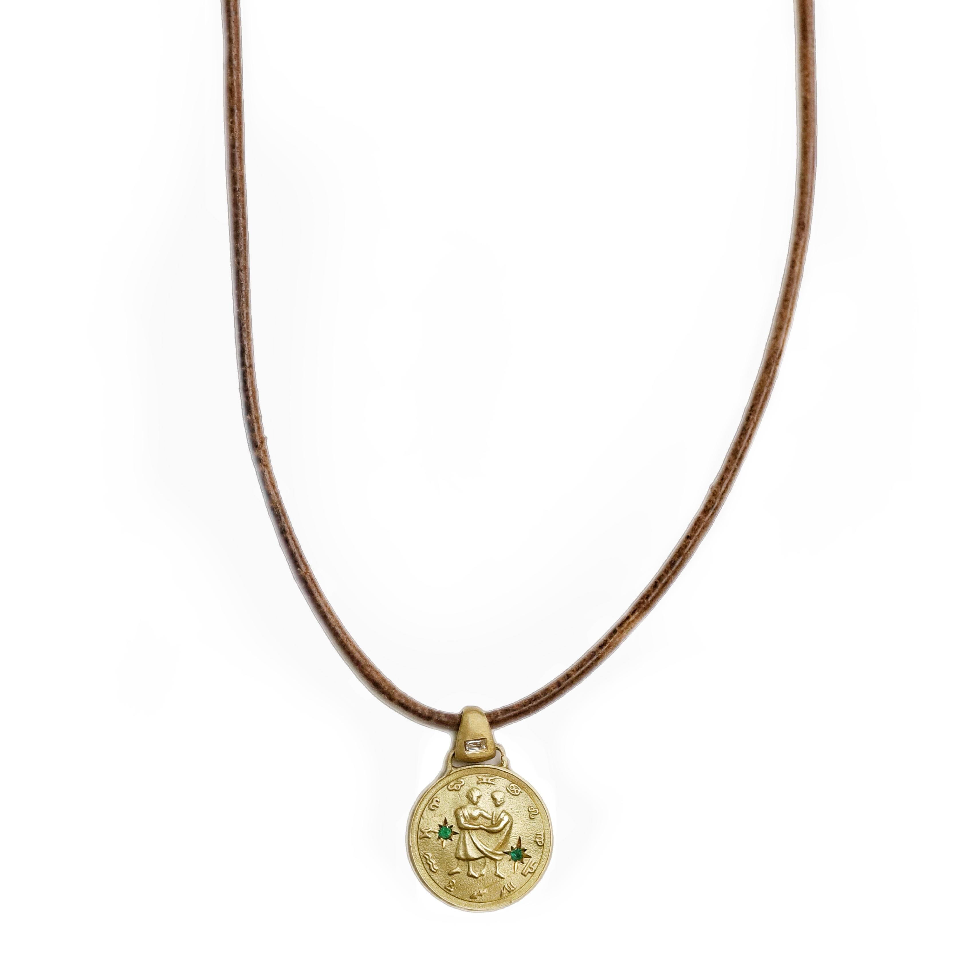 .תליון מטבע משובץ אמרלדים עם חריטה של זוג על חוט עור