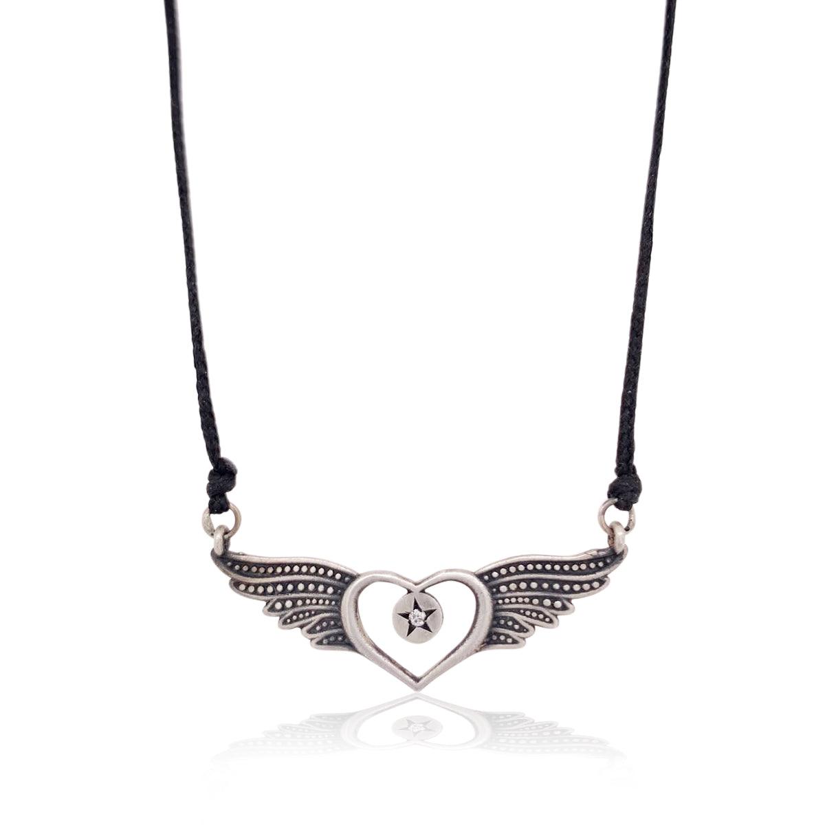 שרשרת מחוט שעווה עם תליון מכסף בצורת לב הנישא באמצעות שתי כנפיים ויהלום בצורת כוכב משובץ באמצע הלב