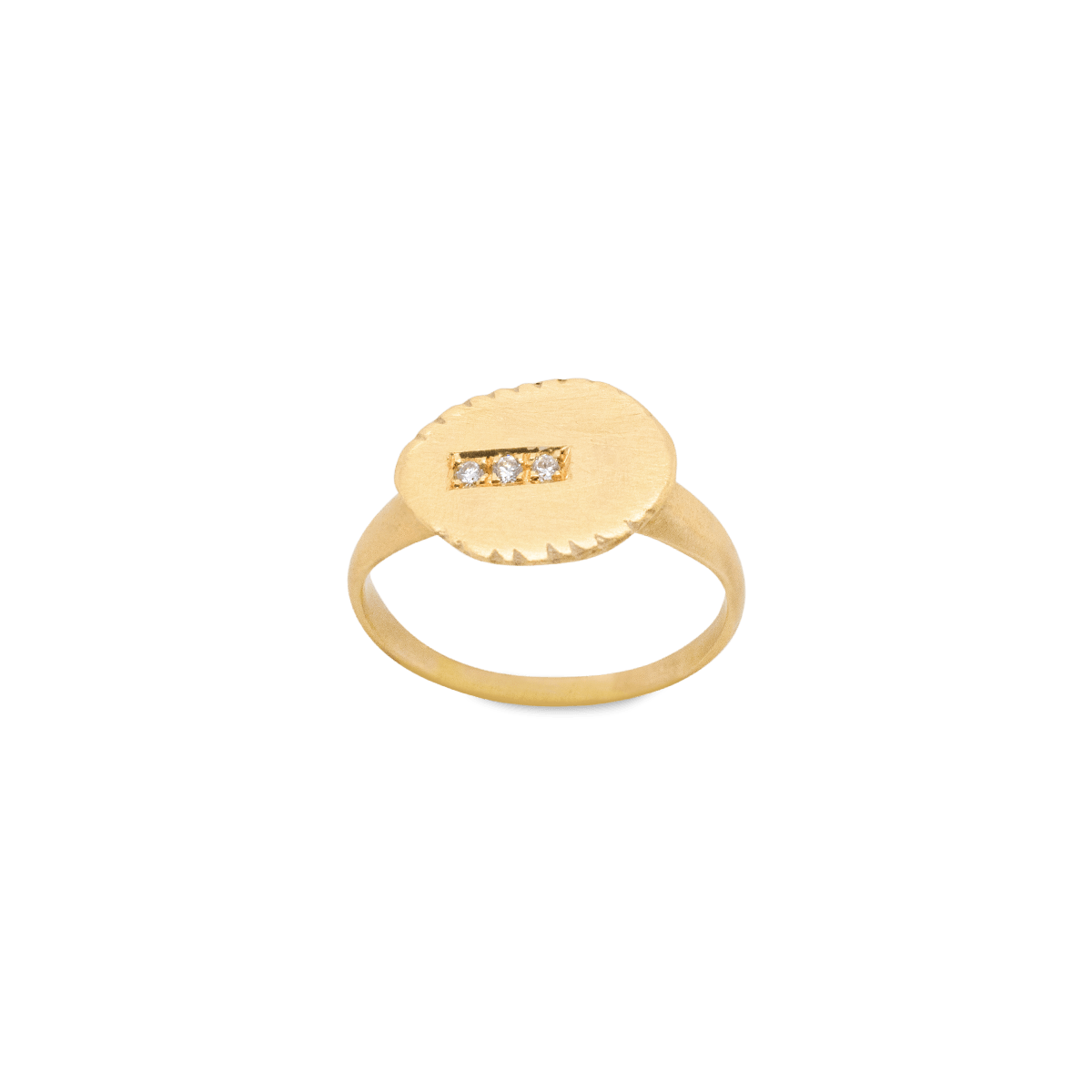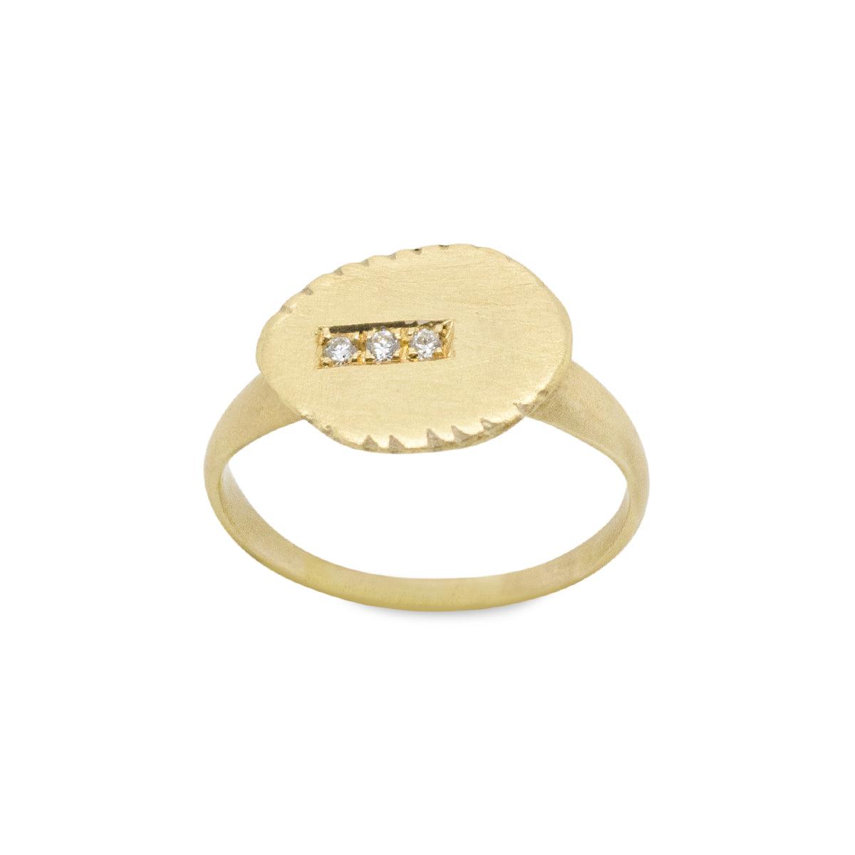 טבעת חותם אובלית עם שלושה יהלומים משובצים בתוך מלבן. שילוב ייחודי של סגנון מסורתי ומודרני