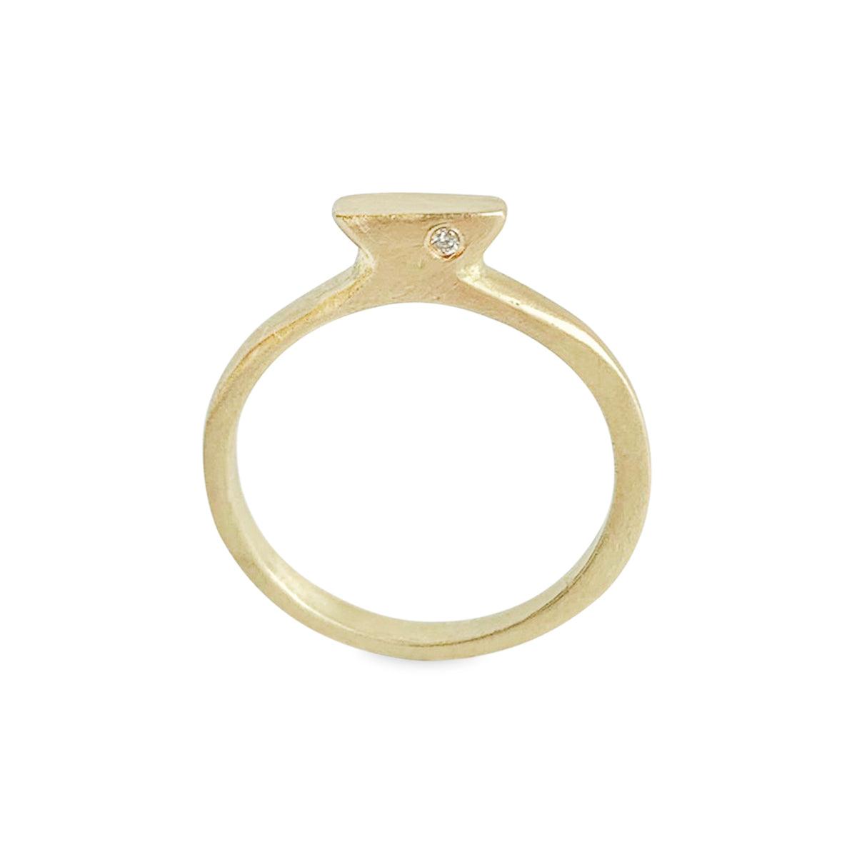 טבעת זהב צרה עם לוחית מוגבהת משובצת יהלום בצד