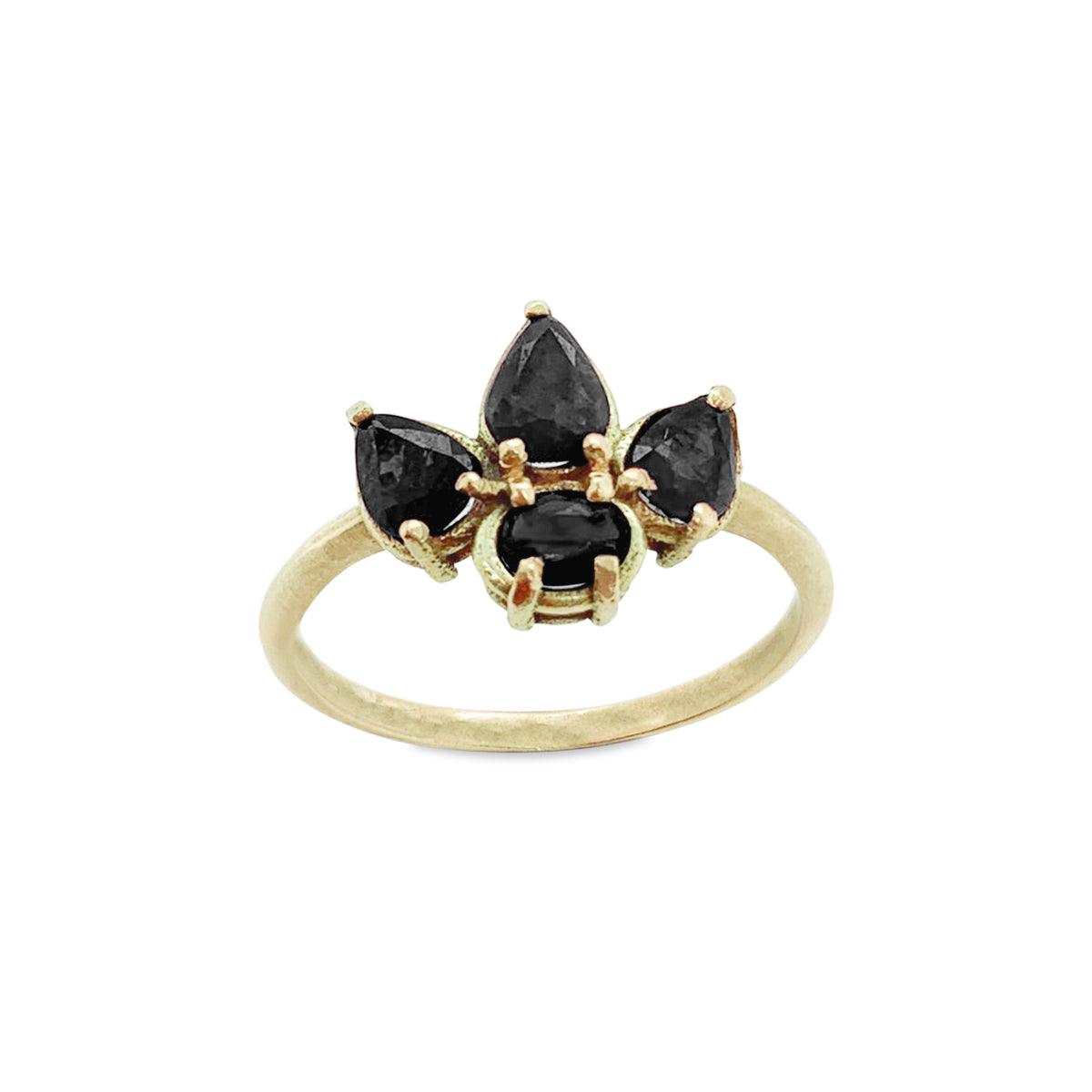 טבעת לוטוס זהב צהוב 18 קראט משובצת יהלומים שחורים. טבעת זו מסמלת כוח והארה