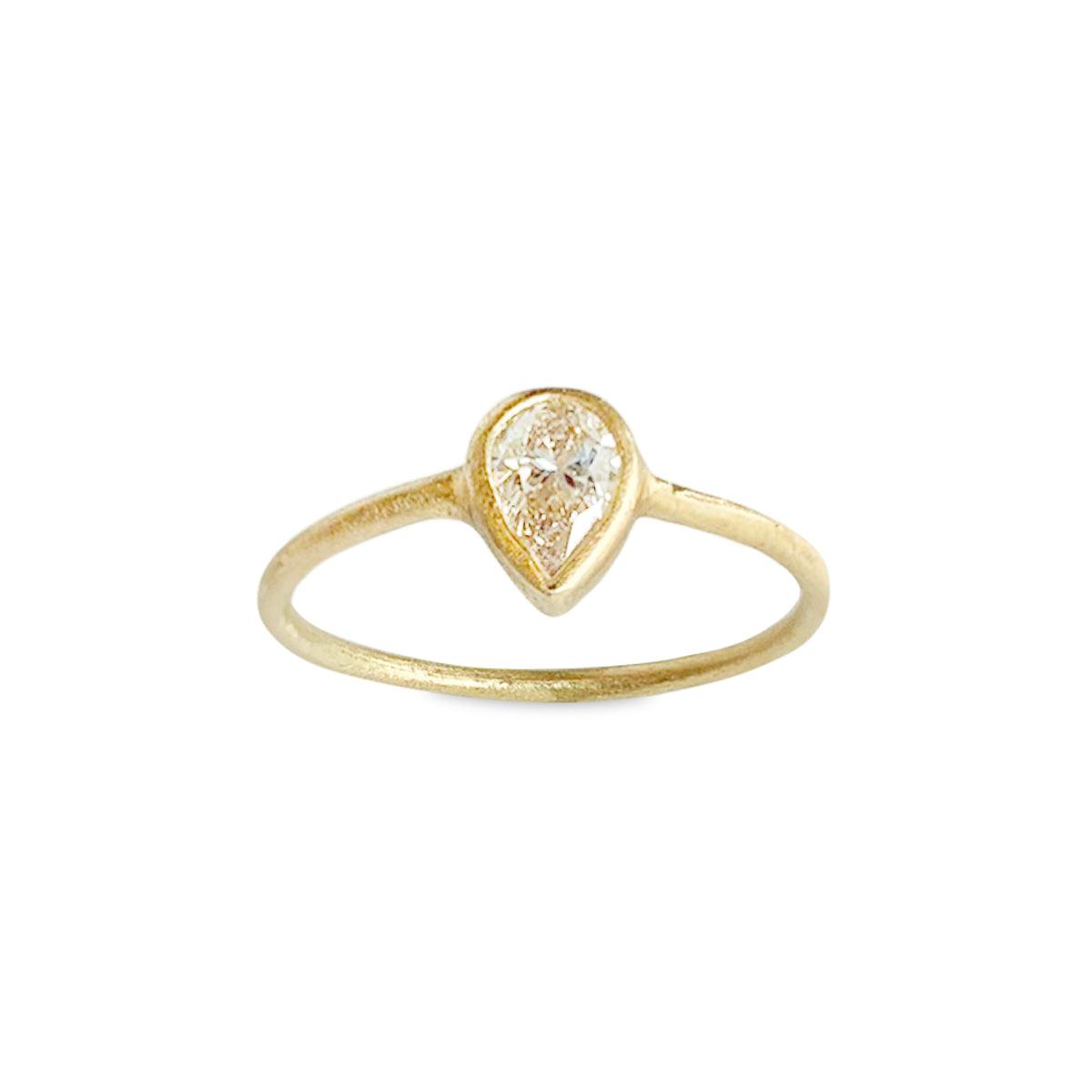 טבעת סוליטר דקה עם יהלום בצורת טיפה בתוך מסגרת מוזהבת