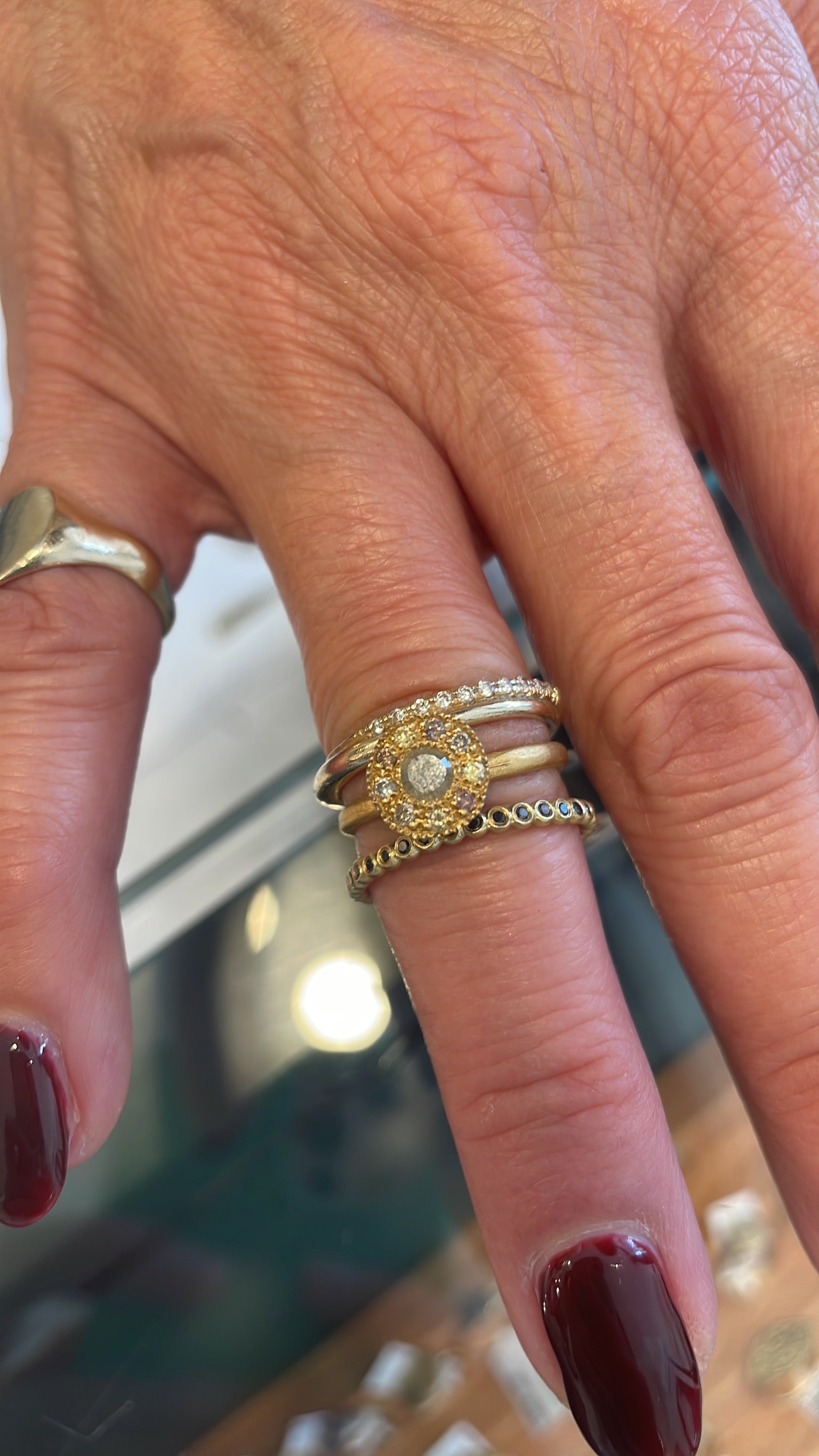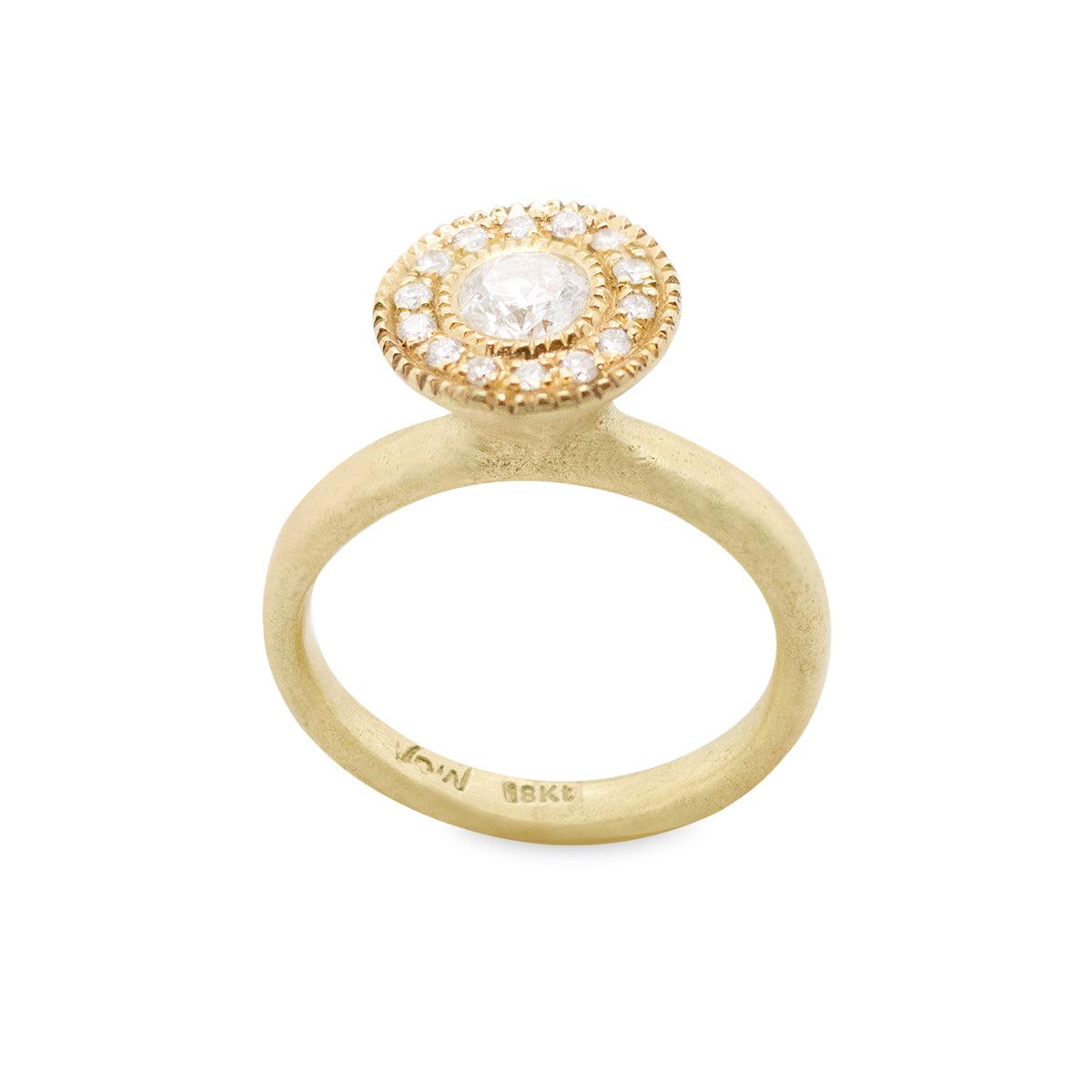 טבעת עם יהלום יחיד ומסביבו יהלומים קטנים יותר, שילוב היוצר טבעת קלאסית וייחודית