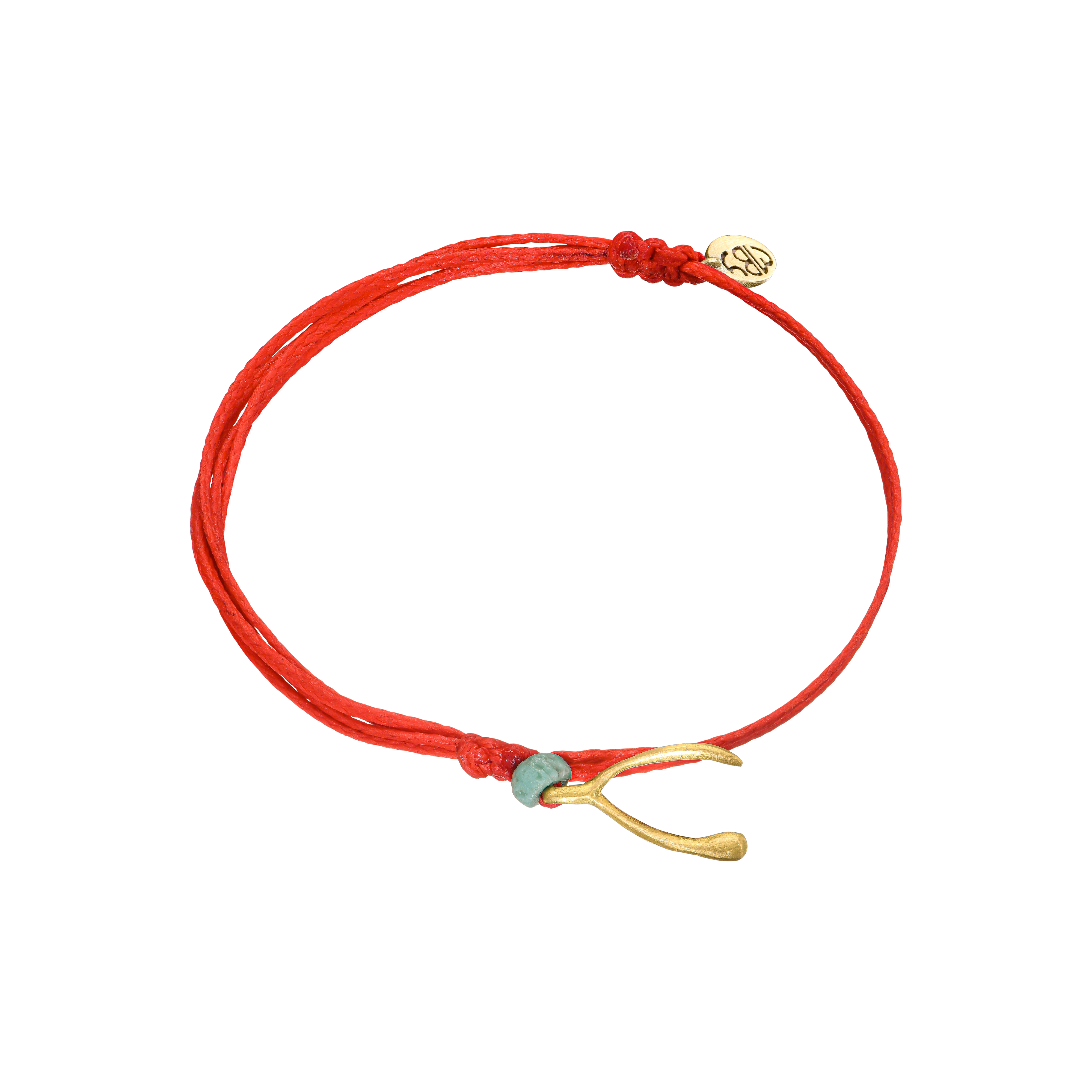 צמיד שרוך אדום עם עצם במשאלות בזהב צהוב או כסף ובשילוב חרוז טורקיז עתיק.