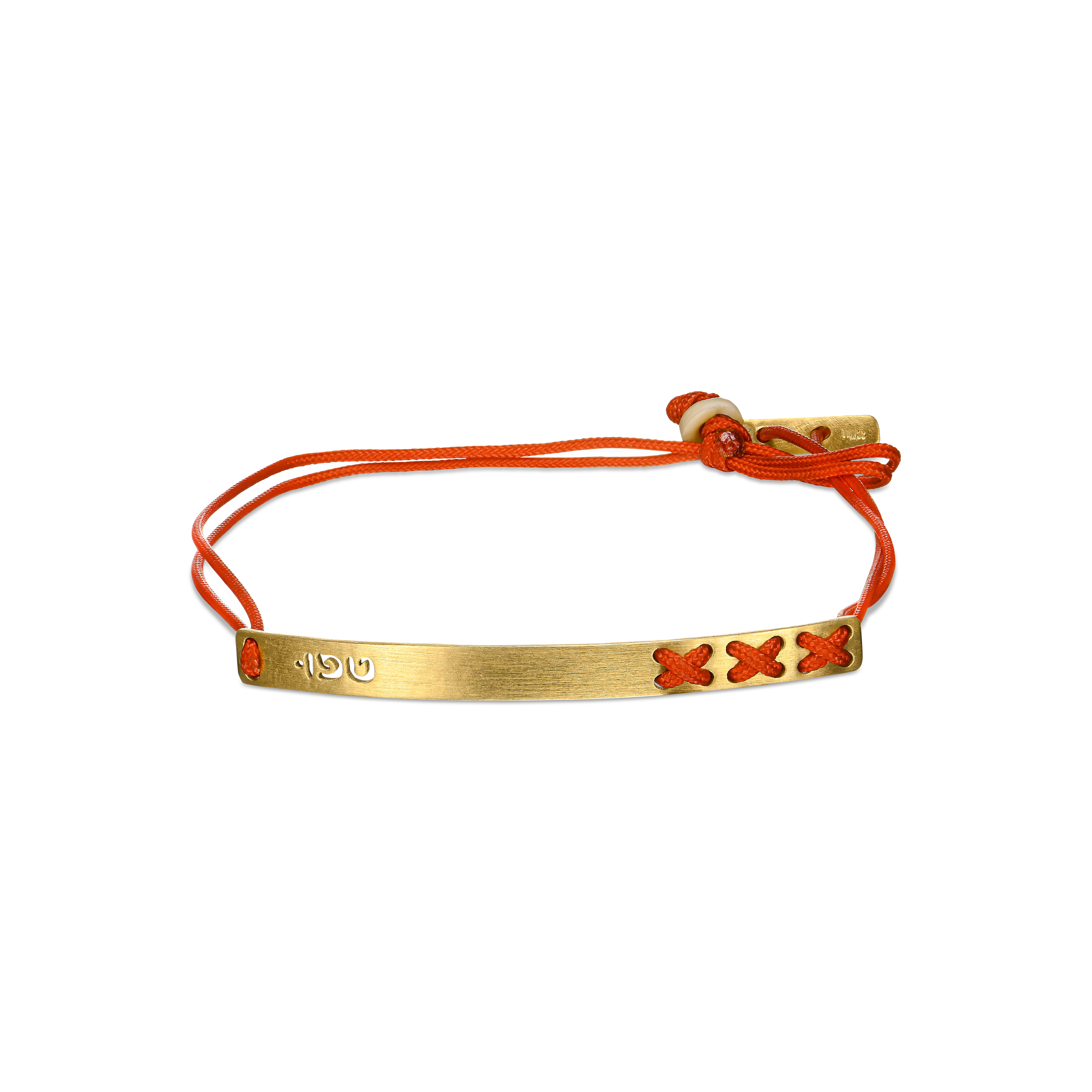 צמיד חוט מתכוונן עם לוחית זהב צהוב 14K עם חריטה של המילה 'טפו' בעברית. הצמיד מגיע עם חוטים במספר צבעים (אדום, חום קפה, שמנת, תכלת, כחול ג'ינס). הצמיד מתכוונן ולכן מתאים לכל גודל פרק כף היד.