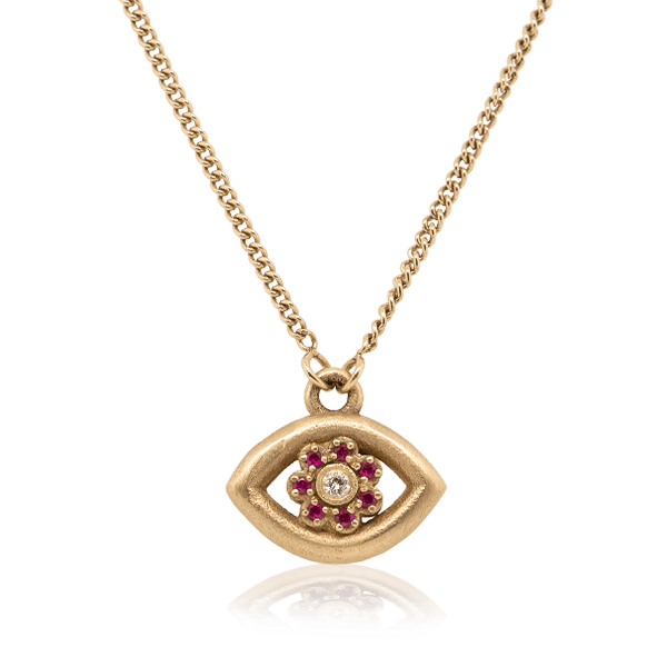 שרשרת זהב צהוב 14 קראט עם תליון בצורת עין המעוטר בפרח מאבני אודם ויהלום במרכז הפרח